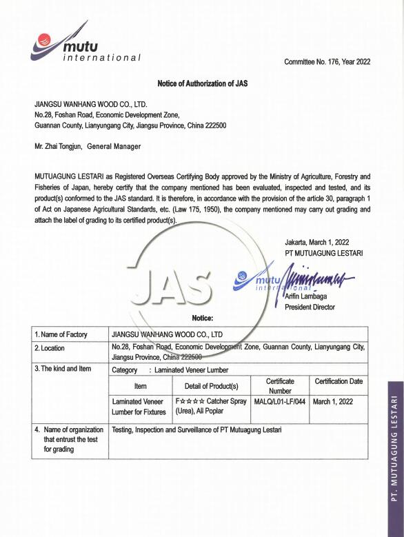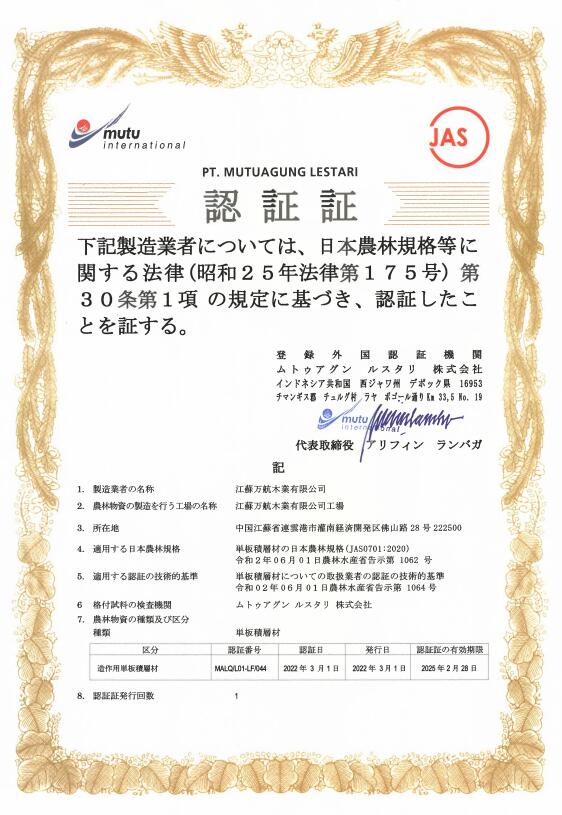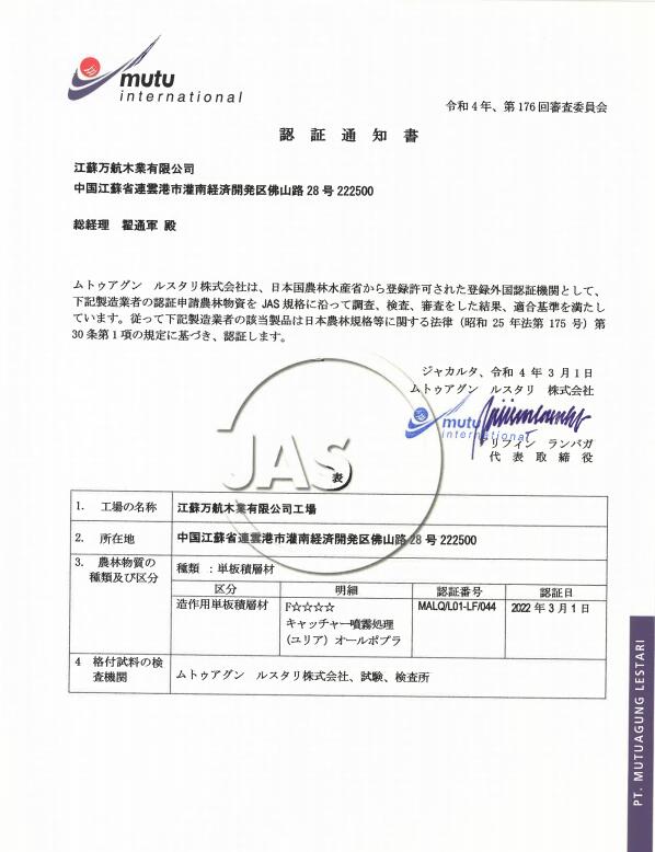 萬航順利通過JAS認證,獲得JAS證書